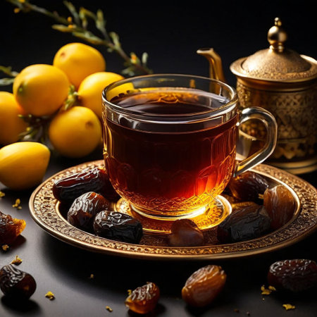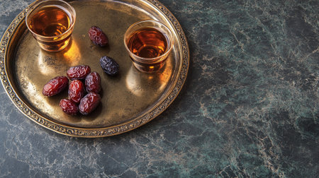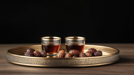 A beautiful arrangement of tea glasses and dates on a decorative tray, perfect for showcasing hospitality and traditional cultural practices in a stylish setting.