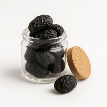 Small clear glass jar filled with ajwa dates with cork lid leaning against it and one date in front on white background islamic food concept for ramadan and gift