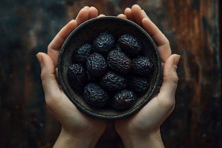 Hand holding sweet dates with blurred background, perfect for text placement and date selection