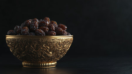 A close-up shot features a decorative golden bowl overflowing with ripe, dark dates, set against a stark black backdrop.