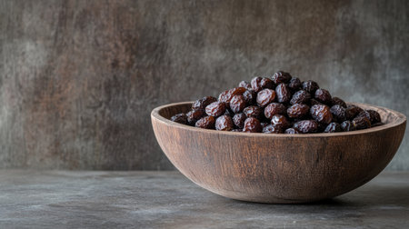 A rich collection of dark brown raisins is elegantly arranged in a wooden bowl, set against a rustic background, highlighting texture and natural appeal.