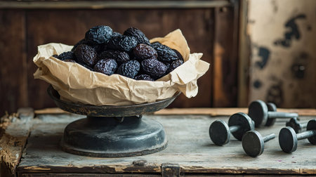 Soft, sweet prunes in a paper sack placed on a vintage scale with weights nearby