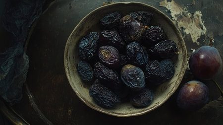 A bowl filled with dried prunes and a few fresh prunes on the side, highlighting the differences in color and texture.