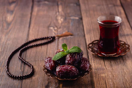 Dried dates fruit, tea and rosary. Popular fruit of Ramadan.