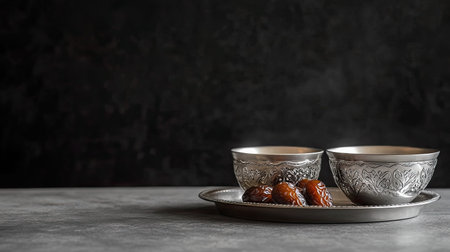 Flat lay of dates and tea on concrete background with copy space for text, top view. Space flat lay of dried date fruit in bowl or plate and arabic herbal drink isolated on grey stone table. Flat layout with empty area for advertising banner or poster design. , stock photo 2/3 place to put your product --chaos 30 --ar 16:9 --v 6.1 Job ID: a8bb917a-a8ad-4e8f-bda4-506949b49ee7