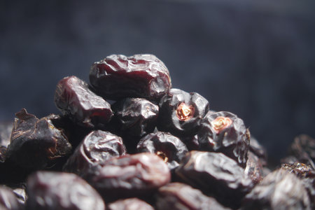 Raw Organic Arabic Dates, Ajwa Dates on light gray background. Ramadan Kareem. Close up.
