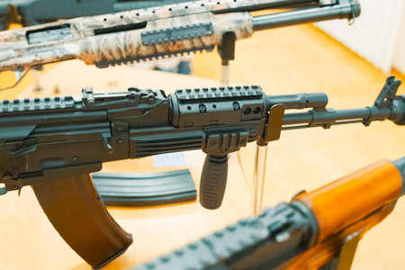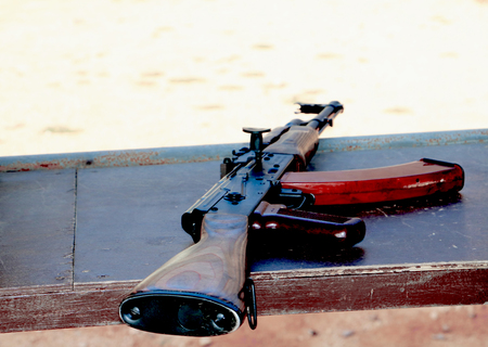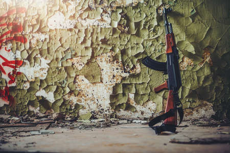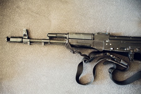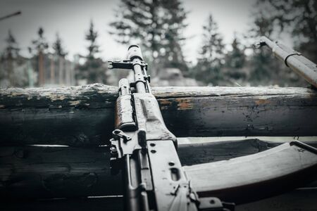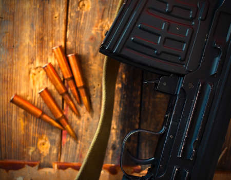 Close up of kalashnikov ak 47 machine gun lying on shabby wooden table surface on defocused blurred background.