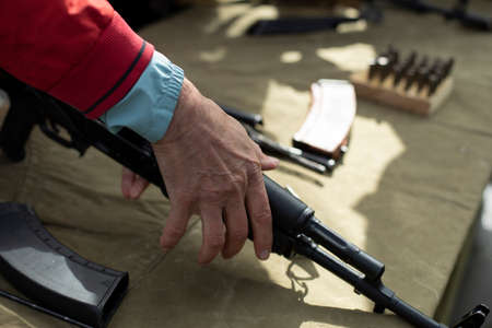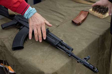 Firearm. Training in the possession of the machine. Lesson on the analysis of a firearm. A person learns to service automatic weapons.