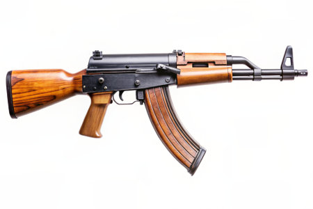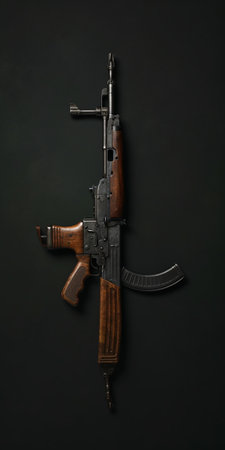 A black and brown AK-47 rifle is on a white background. The rifle is in a position that shows the barrel and the butt