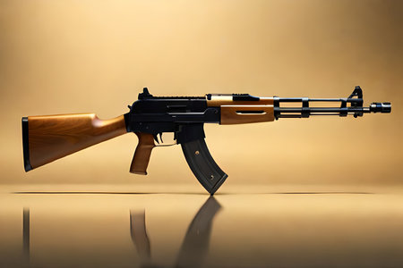 Automatic assault rifle on a lake at sunset. 3D rendering.golden custom ak47 kalashnikov riffle concept