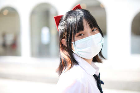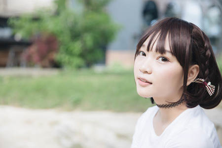 portrait of asian girl with white shirt and skirt looking in outdoor nature vintage film style