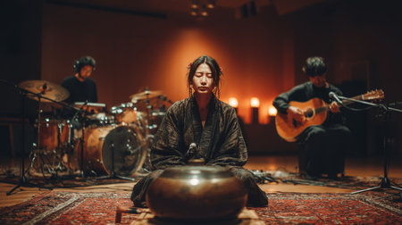Group of korean musicians performing traditional music with unique instruments and serene ambiance