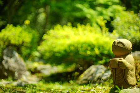 Jizo stone statue standing in Japanese garden of Seigan-ji temple at tender green season (Maibara, Shiga, 2022, May)
