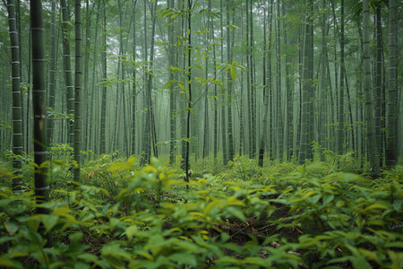 Tall bamboo stalks rise majestically in a vibrant green forest enveloped in a thin layer of mist during the early morning. The tranquil atmosphere creates a serene environment inviting exploration.