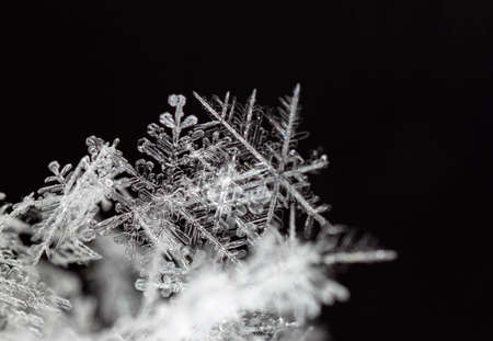 Snowflakes on a black background. Macro photo with shallow depth of field.