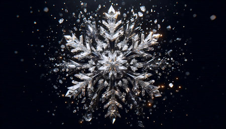 A mesmerizing close-up of a single, intricately snowflake resting on a dark surface. Perfect for winter themes.