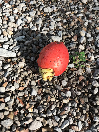 Top view of ripe cashew fruits drying in the sun for harvesting cashew nuts