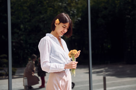 Against building with big windows. Beautiful brunette is standing outdoors with flowers in her hands.