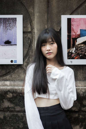 Portrait of thai adult beautiful girl white shirt black skirt relax time