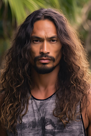 A peaceful headshot of a Pacific Islander man with flowing hair, gazing into the camera.