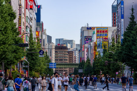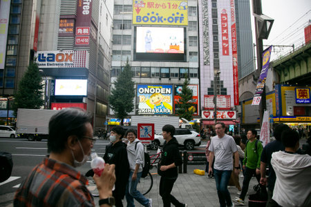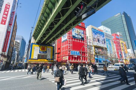Akihabara, Japan - 23 April 2019 - People walk across main street of famous Akihabara's electronics shopping area on April 23, 2019