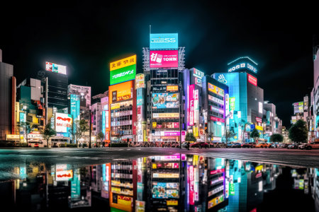 This image presents a stunning night-time cityscape bathed in neon lights, with reflections on streets creating a futuristic atmosphere. Resplendent.