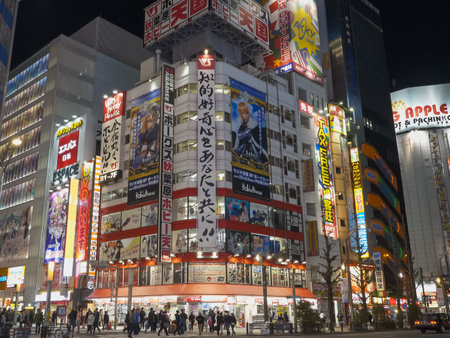 TOKYO, JAPAN - APRIL, 18, 2018: nighttime view of a colorful building exteriors at akihabara in tokyo