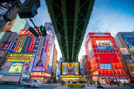 Tokyo, Japan - MARCH 28, 2017: Neon signs and billboard advertisements in Akihabara electronics hub at twilight on March 28, 2017