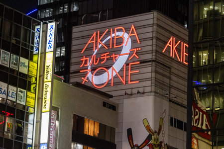 Tokyo, Japan, October 31, 2023: Illuminated sign of AKIBA ZONE at night