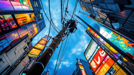 Urban nightscape in Japan with a tall telephone pole stretching toward overhead cables, surrounded by futuristic neon-lit skyscrapers.