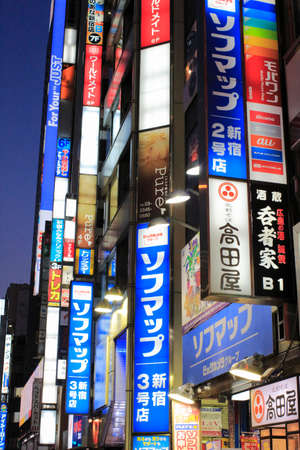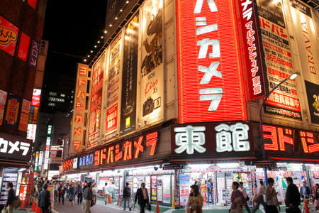 Neon signs at Akihabara district in Tokyo, Japan. Akihabara is a major shopping street in Tokyo.