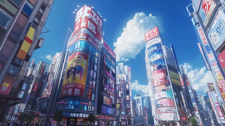 Futuristic anime city with large skyscrapers, digital billboards, and neon streets