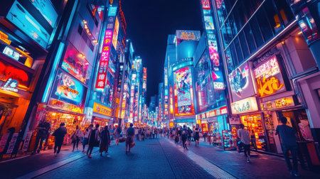 This captivating image captures a vibrant urban nightlife scene filled with colorful neon lights, busy streets, and an energetic atmosphere. Perfect for showcasing the allure of city living and travel adventures.