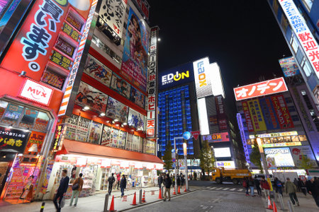 TOKYO, JAPAN - DECEMBER 1, 2016: People walk in Akihabara district of Tokyo, Japan. Akihabara district is known as Electric Town district, it has reputation for electronics stores and otaku culture.