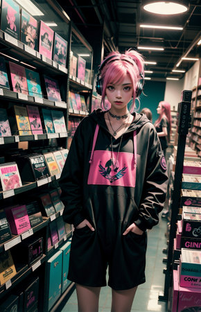 Beautiful young woman with pink hair in a leather jacket and headphones posing in a music store.