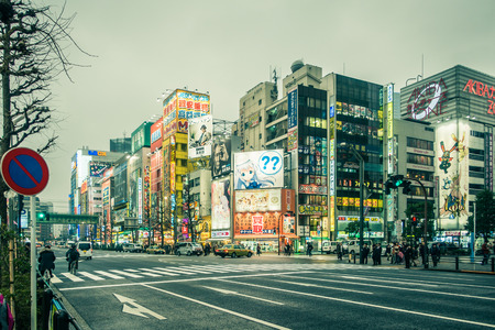 Tokyo, Japan - February 18, 2014: View of the Akihabara district. Akibahara is the center of shopping for games, anime, manga, and electronics.