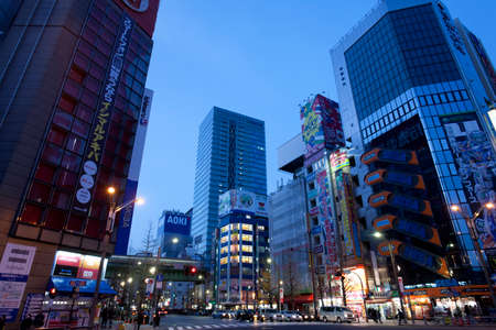 Tokyo, Japan - MARCH 28, 2017: Neon signs and billboard advertisements in Akihabara electronics hub at twilight on March 28, 2017