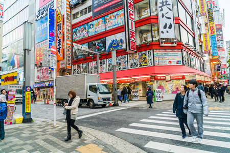 Tokyo, Japan - January 24, 2016: Akihabara district in Tokyo, Japan. Akihabara district is very crowded and closed for car traffic every Sunday, so pedestrians can walk freely.