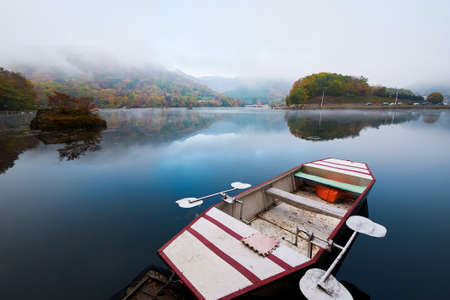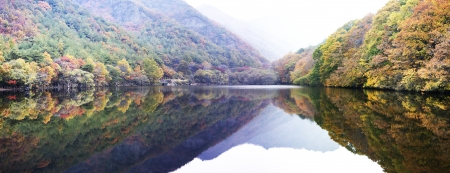Autumn mountain lake with fog and reflection scenery view