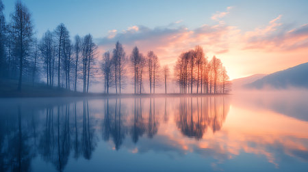 Generative AI Image of Calm Lake with Misty Fog and Trees at Sunrise