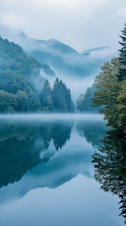 A tranquil mountain lake shrouded in mist reflects the lush greenery and towering trees surrounding it The calm waters create a picturesque landscape ideal for nature lovers