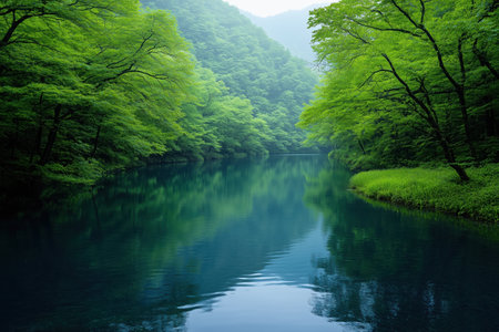 Beautiful summer season scene of lake. green reflective forest view of Japan Asia. Water reflection nature photography. The beauty of nature concept background.