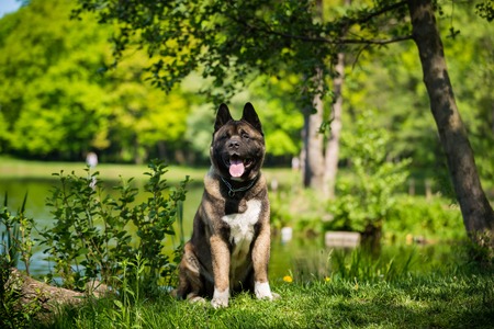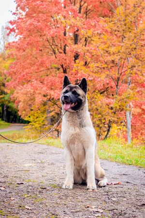 Akita breed dog on a walk in the autumn park. Beautiful fluffy dog. American Akita. Dog for a walk