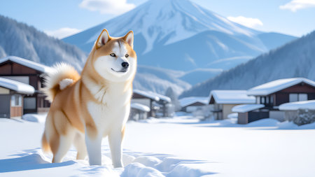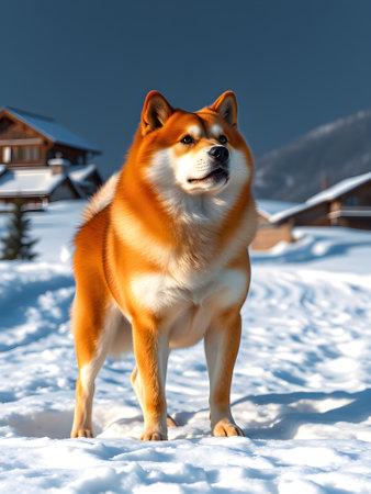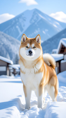 Photorealistic winter scene of an Akita Inu dog standing in fresh snow in an alpine mountain village with wooden chalets, dramatic peaks and warm golden light, captured with high detail and a calm atmosphere. Created with AI
