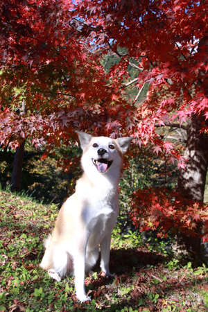 Happy puppy Shiba Inu walking in the autumn park. Dry yellow leaves background.