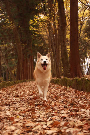 Shiba inu dog running in autumn forest. Shiba inu is a Japanese breed of dog.