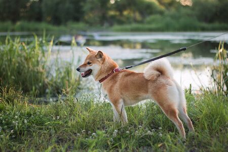 A young dog Shiba inu stands on the Bank of a pond on the green grass in the rays of the summer sun at sunset. Front view
