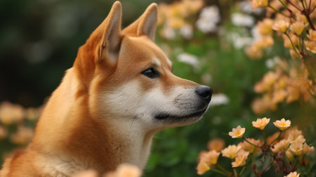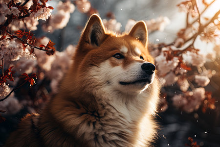Akita Inu on the background of flowering trees, close-up photo, Ai generative art