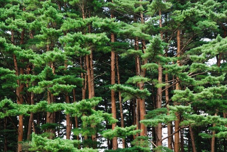 Fir tree forest in the yellow morning sun light at dawn in the mountain, Taiwan.