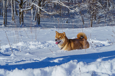 The Shiba Inu Japanese dog plays in the snow in winter.